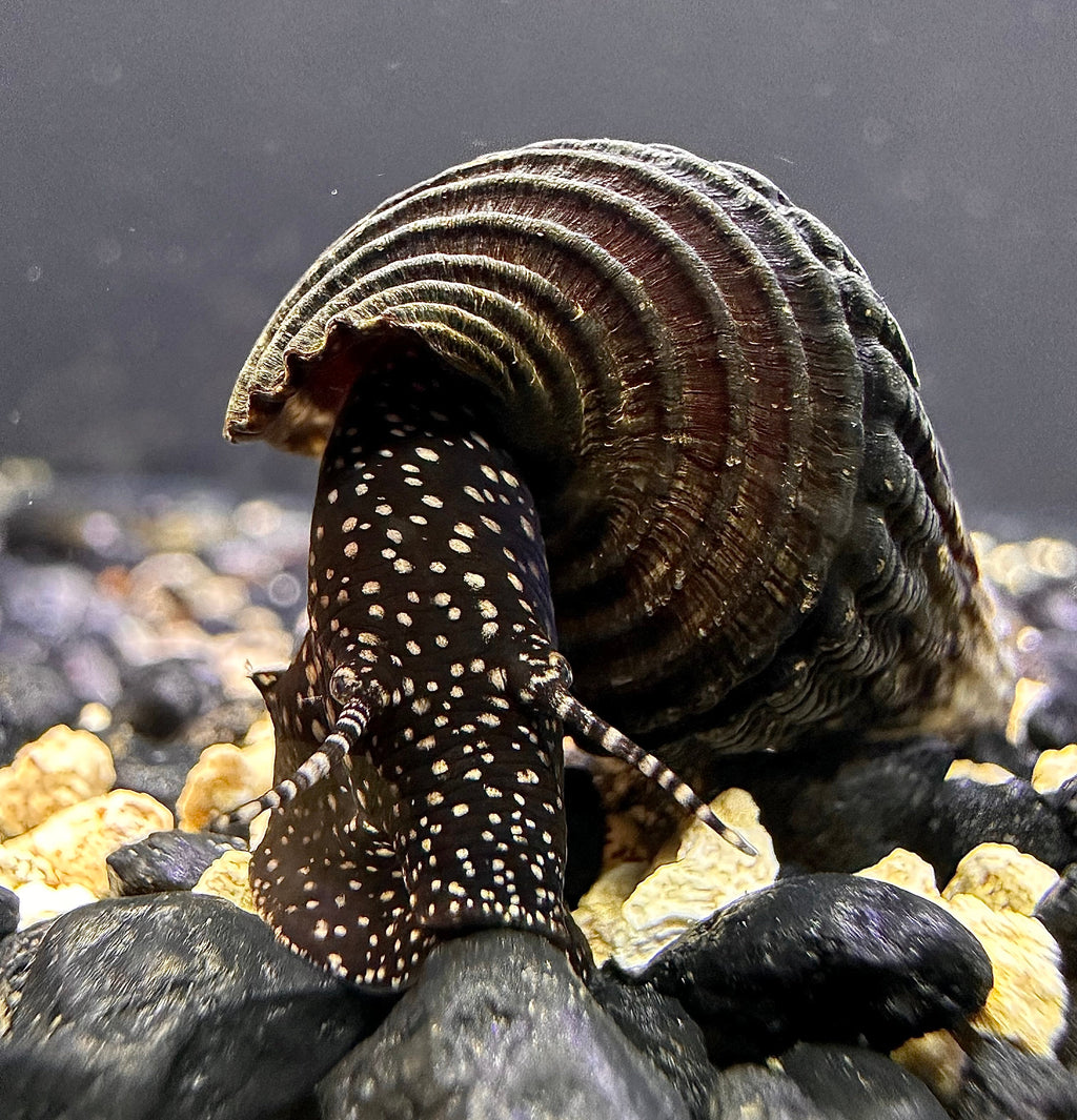 This aquatic mollusk is one of the most sought-after snail in the aquarium hobby. Snails from the Tylomelania Genus are known as "Sulawesi Snail", "Elephant Snail", or "Giant Rabbit Snail". These  elephant faced creatures came to us from freshwater lakes in Indonesia and the peaceful nature of the Rabbit Snail is one factor that makes is interesting to keep them. They have long rugged spiral like brown, yellow, and white shells that can grow up to 4.5" long.