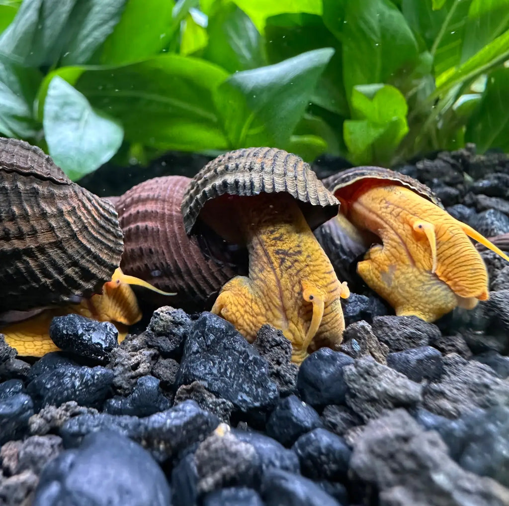 This aquatic mollusk is the most sought-after snail in the aquarium hobby. Snails from the Tylomelania Genus are known as "Sulawesi Snail", "Elephant Snail", or "Giant Rabbit Snail". These elephant faced creatures came to us from freshwater lakes in Indonesia and the peaceful nature of the Rabbit Snail is one factor that makes is interesting to keep them. They have long rugged spiral like brown shells that can grow up to 4.5" long.