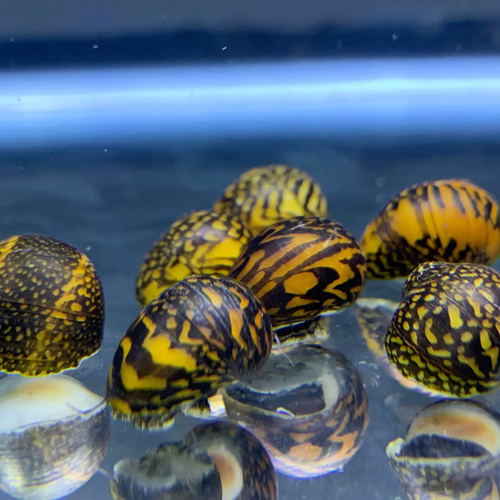 Naturally from India, these Nerite Snails are some of the hardest to find in the aquarium hobby. They are easy to breed in captivity but their eggs will only hatch in brackish water, so you don't have to worry about them breeding in your aquarium. Nerite snails are extremely hardy and live in a vast variety of water parameters. Batik Nerite Snails have an amazing shell color - they are yellow/light orange with black zig-zags/scribles. They are very good scavengers that will dig under the gravel, if needed, to get that extra algae meal.