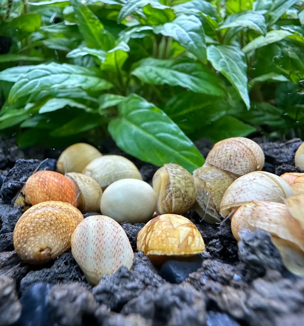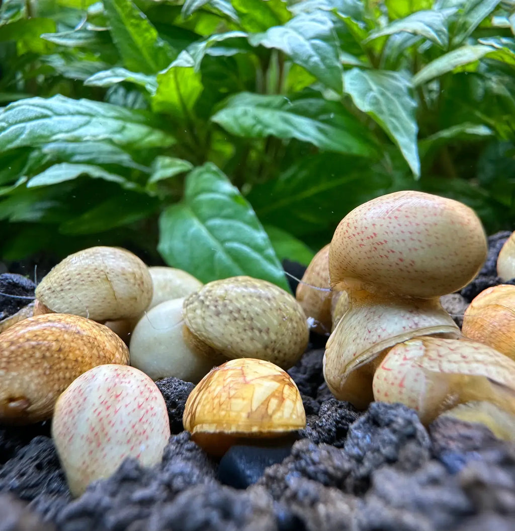 Naturally from Asia, these Nerite Snails are some of the hardest to find in the aquarium hobby. They are easy to breed in captivity but their eggs will only hatch in brackish water, so you don't have to worry about them breeding in your aquarium. Nerite snails are extremely hardy and live in a vast variety of water parameters. Red Pumpkin Nerite Snails have an amazing shell color which can vary - from red and pink with unique white dots/scribbles, to orange/yellowish with dark stripes. They are very good scavengers that will dig under the gravel, if needed, to get that extra algae meal.
