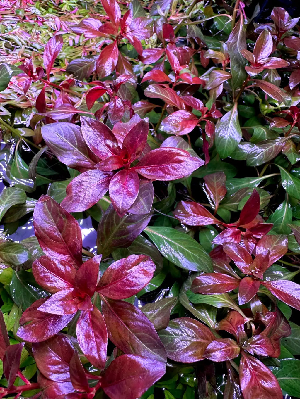 Dark Red Ludwigia is a mid-ground/background plant native to North, Central, and South America. This unique plant is quite rewarding when grown properly and can tolerate different water parameters. When grown submersed this plant develops broad, spade like leaves that are bright red on the underside. Its coloration is absolutely stunning - this plant makes a great contrast between its bottom half (green) and top half (bright red). Should be trimmed regularly. This plant can be easily propagated by simply cutting of the stem and replanting it on the substrate.
