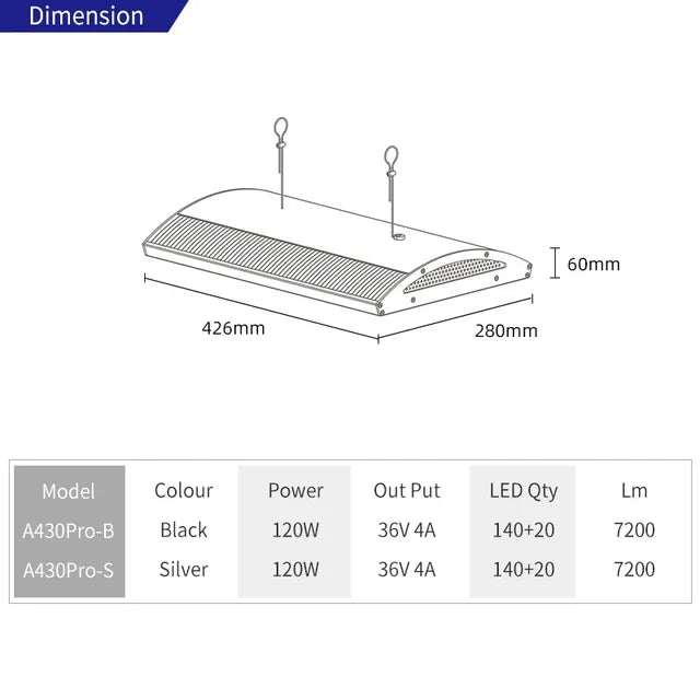 The Week Aqua A430 PRO is designed for aquascapers who want professional lighting power in a smaller footprint. It combines a robust 120 W output with 140+20 high-efficiency LEDs, delivering a bright, balanced RGB-UV spectrum that promotes lush plant growth and enhances underwater color vibrancy.